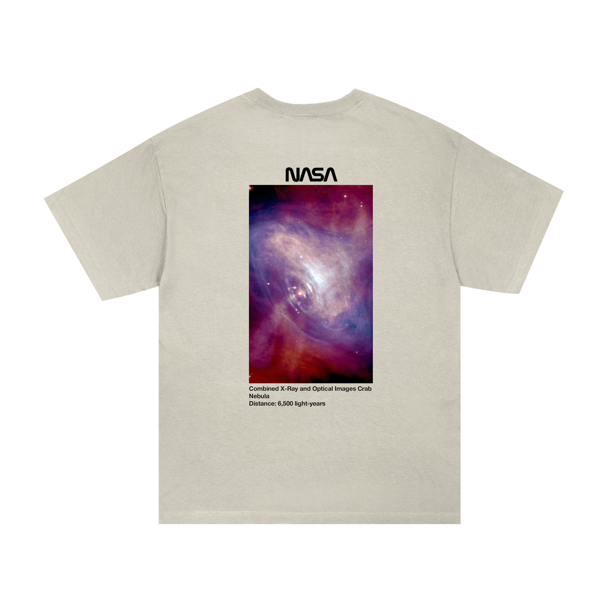 A visual record of deep space. The Crab Nebula sits on the back of this cream tee — a calm front, with a story stretching 6,500 light-years behind it. Soft hand. Designed for longevity.